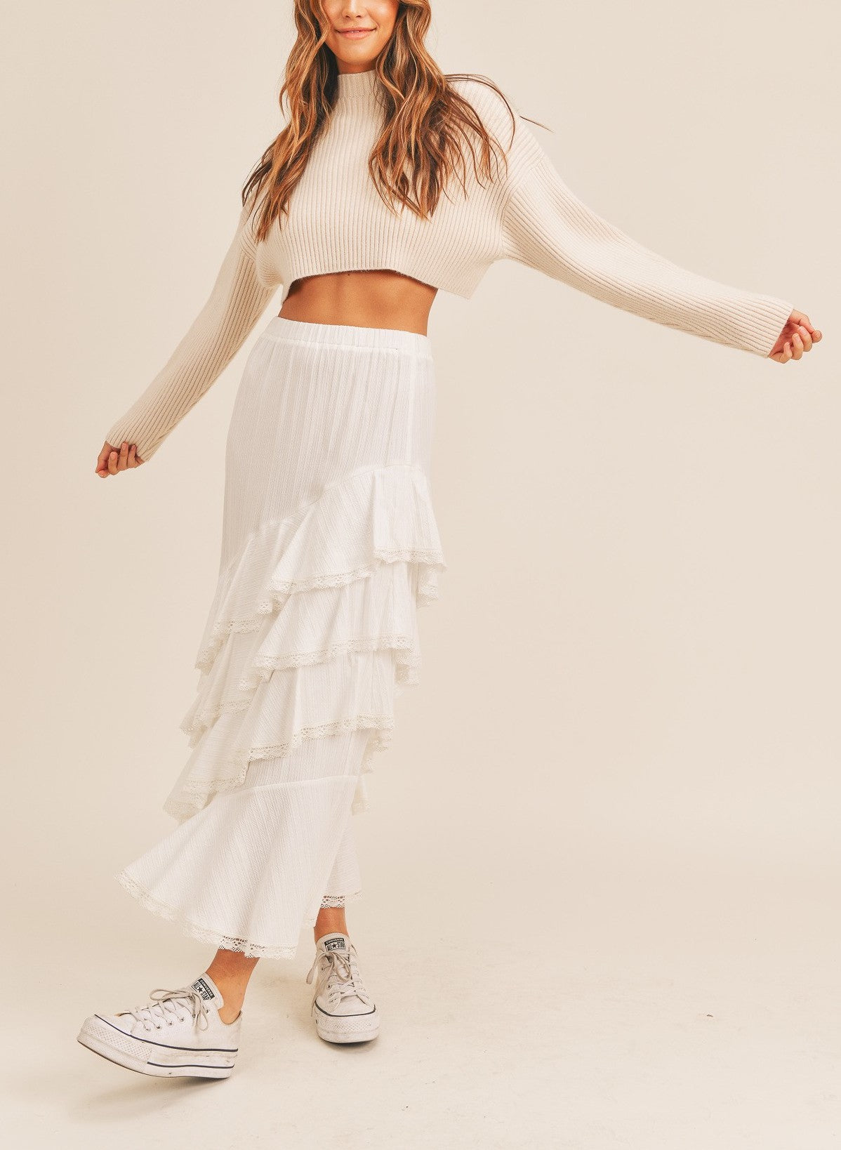 Elevate your style with this elegant and versatile neutral-toned skirt, with lace crochet trim detail. Perfect for any occasion.